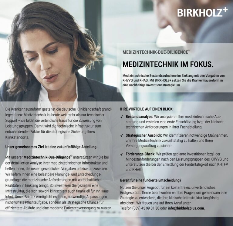 Das Krankenhausversorgungsverbesserungsgesetz (KHVVG) setzt für die neuen Leistungsbereiche/-gruppen spezifische medizintechnische Mindestanforderungen voraus und definiert digitale Standards. Sind die Funktionsabteilungen Ihres Krankenhauses darauf vorbereitet? Eine bewährte Methode, um dies herauszufinden, ist die Medizintechnik-Due-Diligence© von BIRKHOLZ+. Mit unserer Medizintechnik-Due-Diligence© verfolgen wir das Ziel, die aktuellen Digitalisierungsmaßnahmen sowie die technische Ausstattung einer Funktionsabteilung sach- und fachgerecht zu bewerten.…